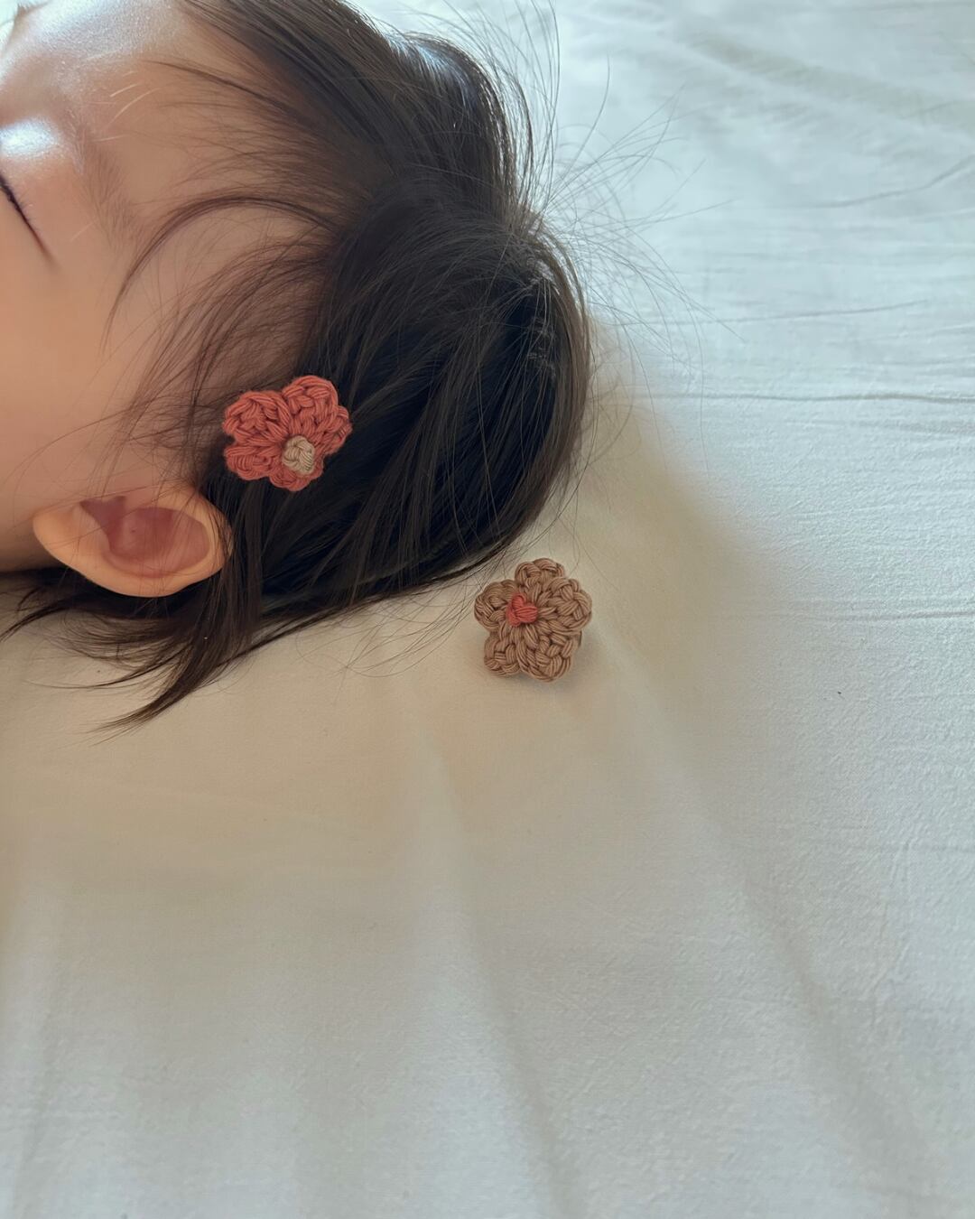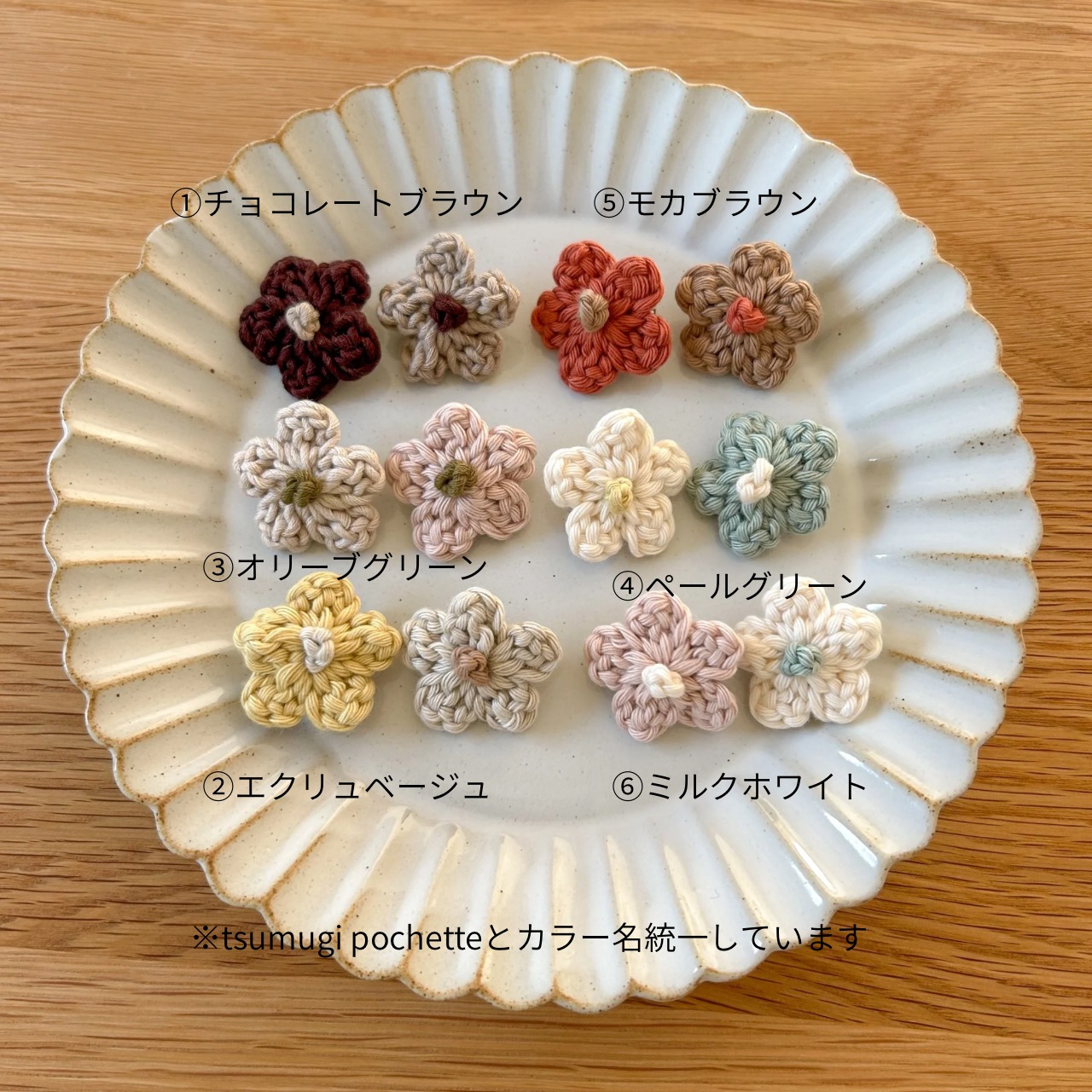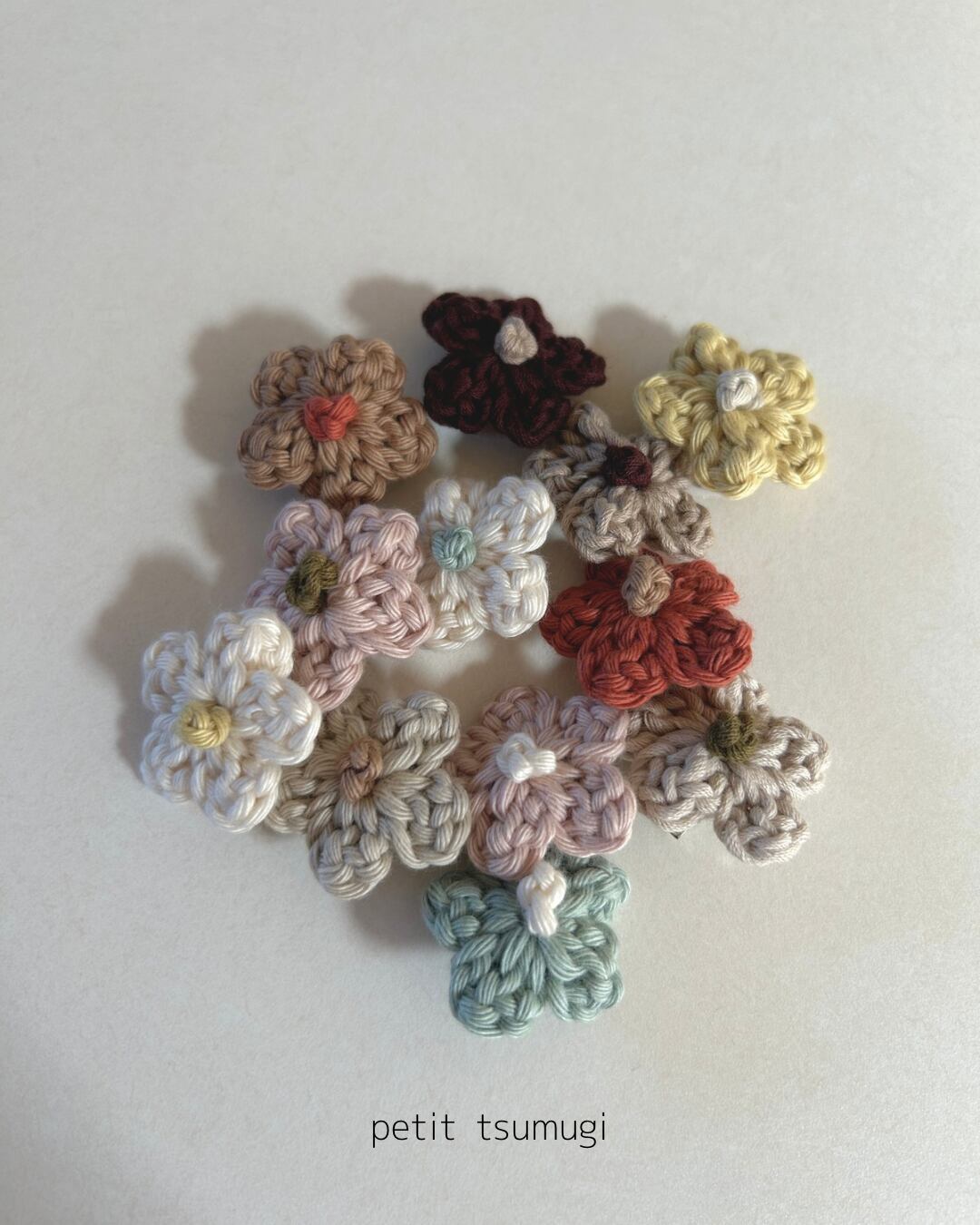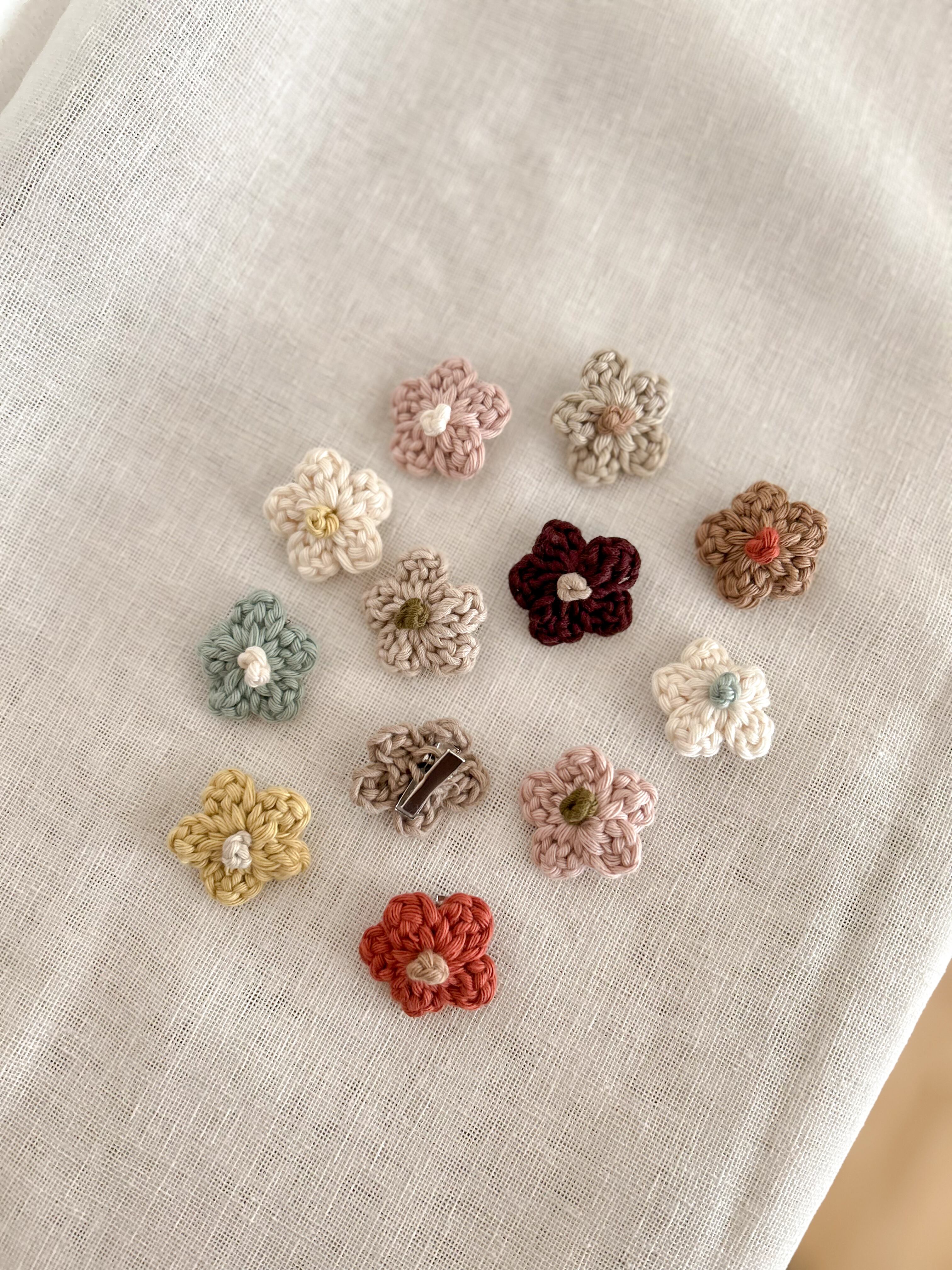 tsumugi pochette(つむぎポシェット)と同じ糸で編んだ、ちいさなお花のヘアピン。