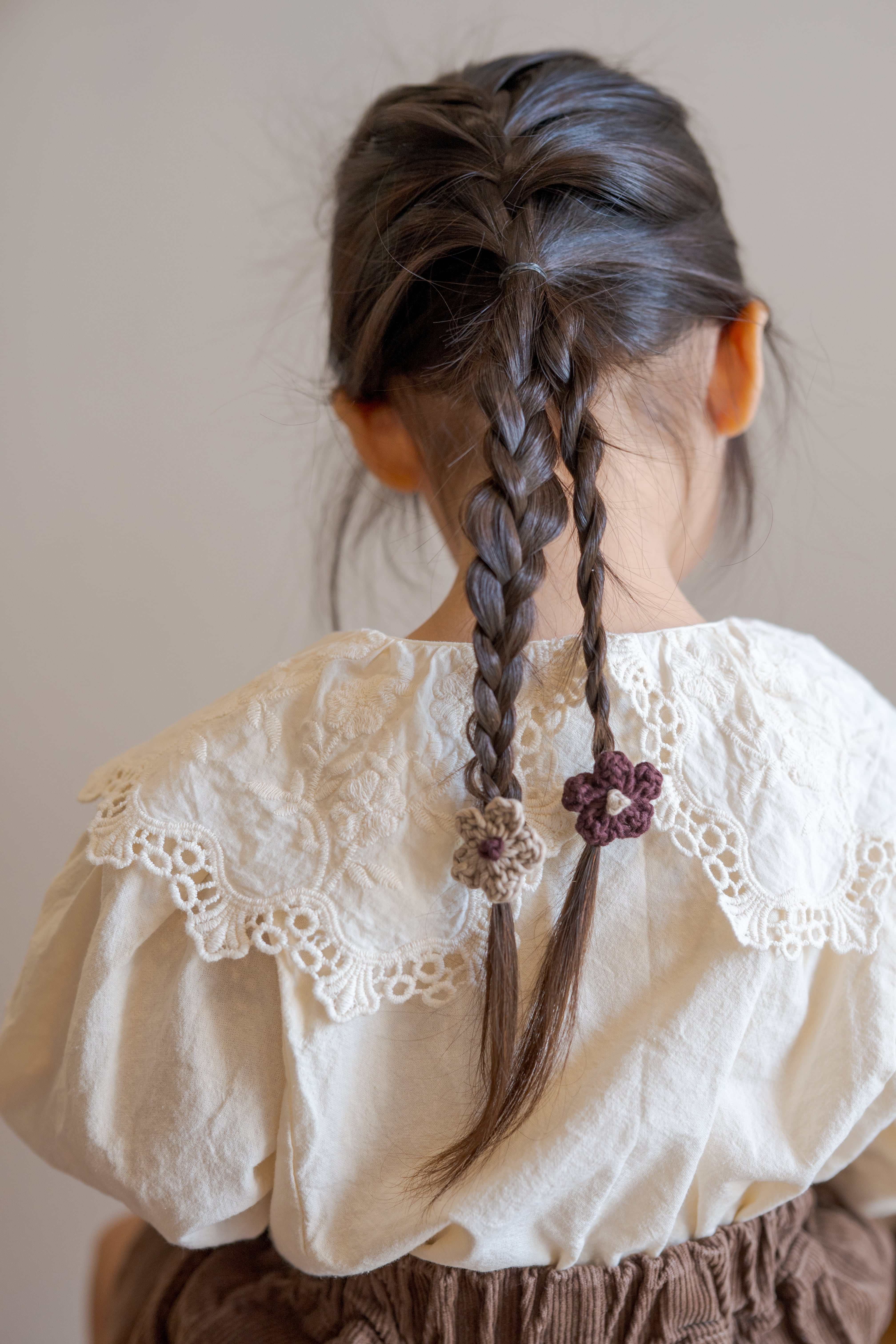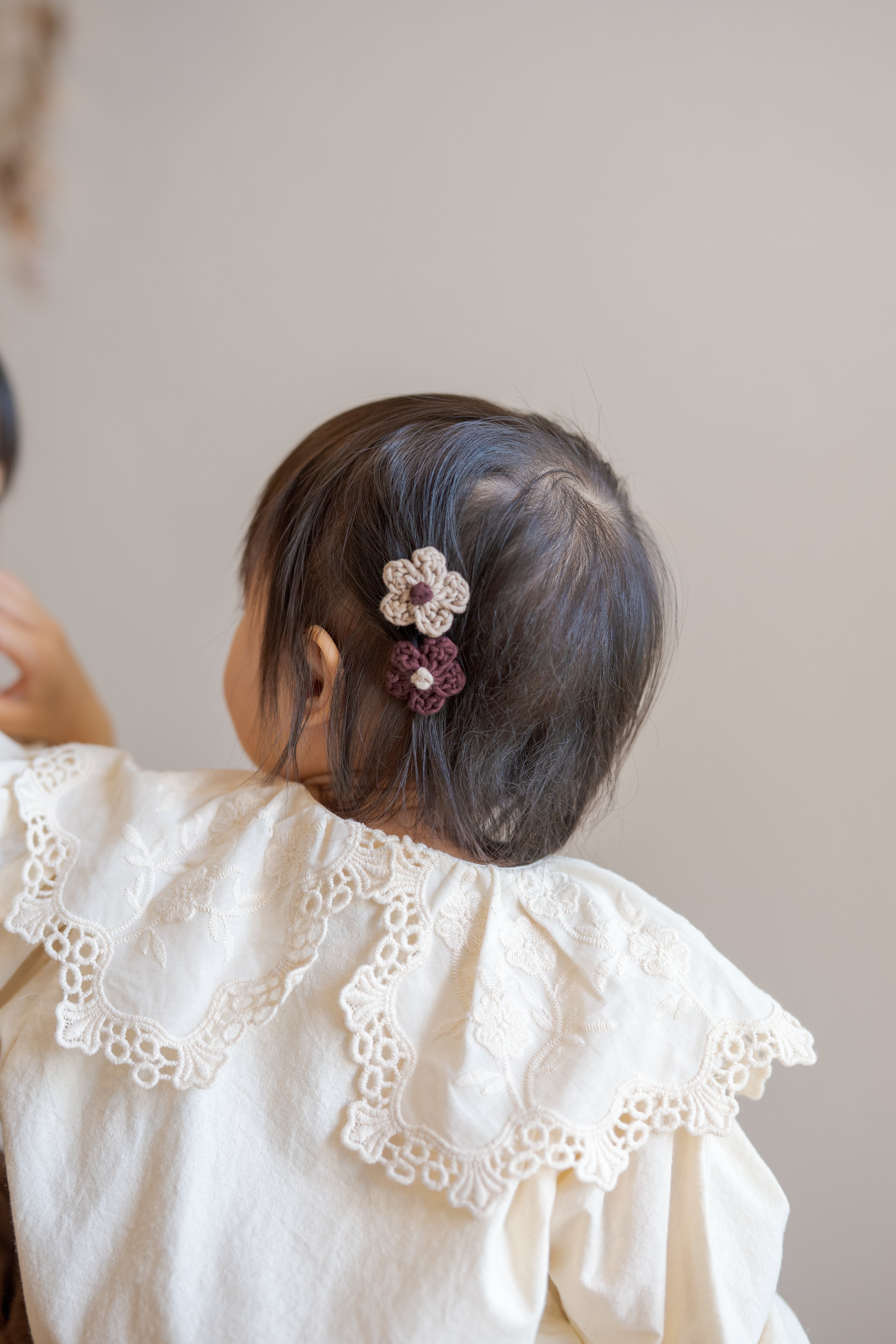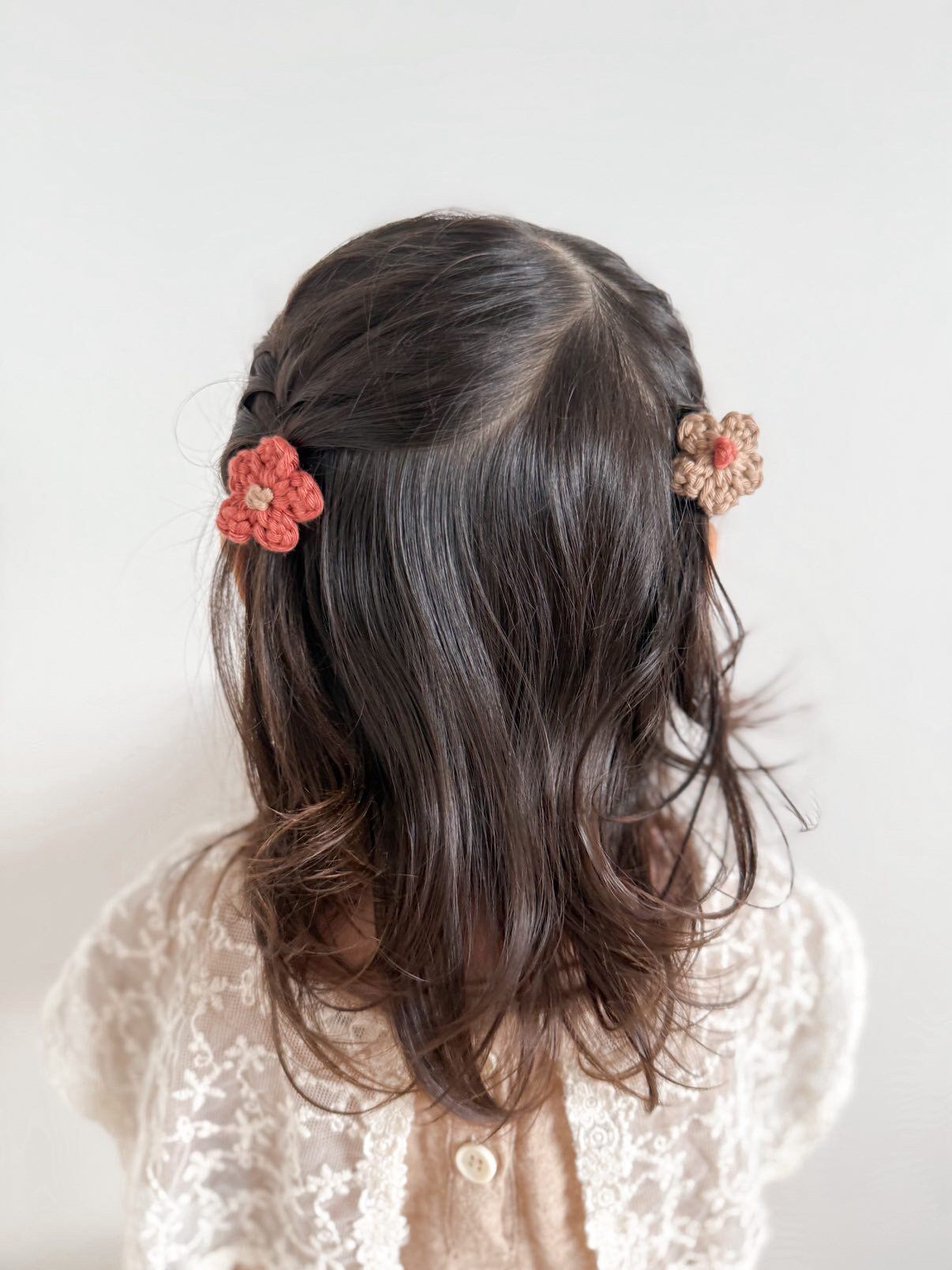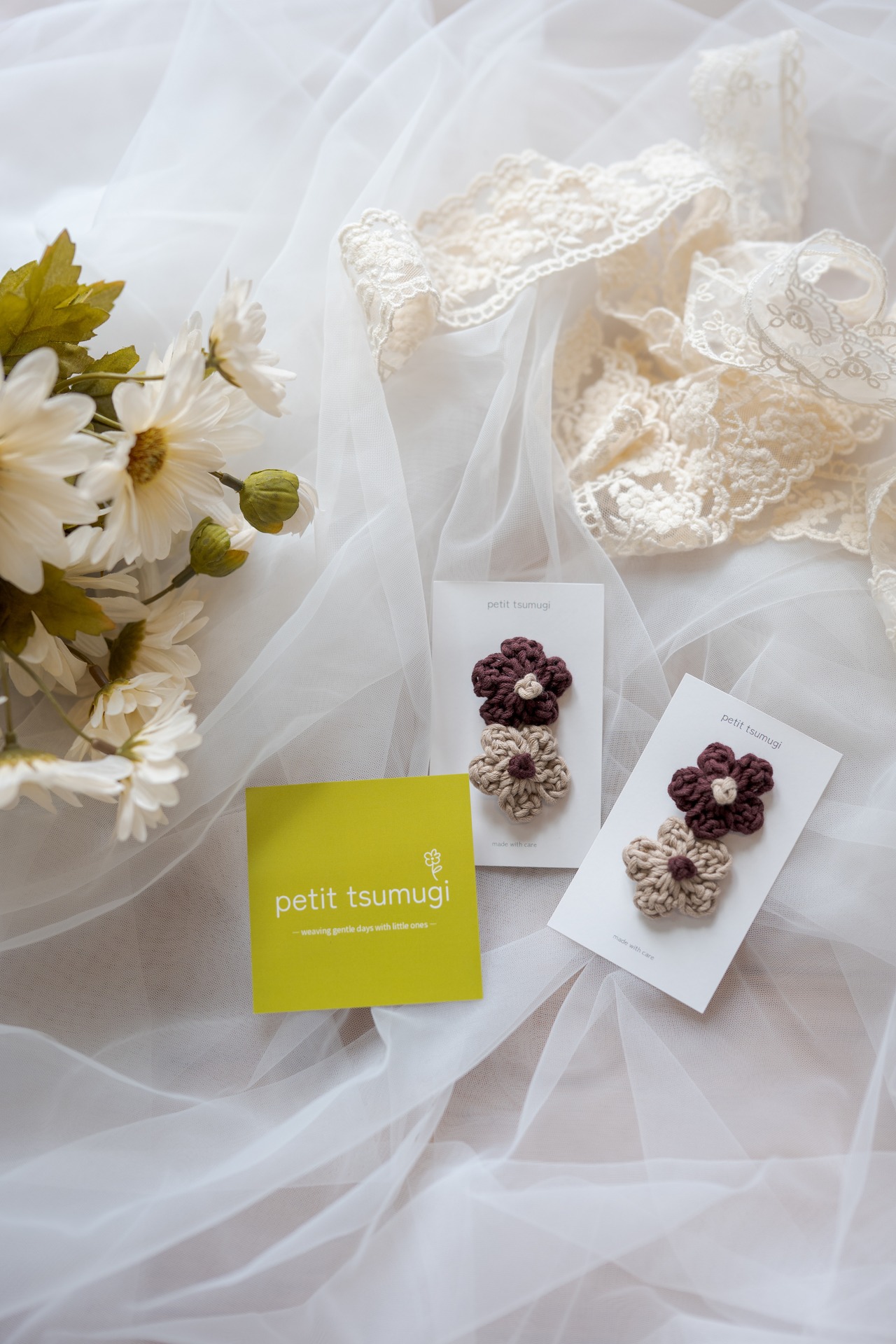 tsumugi pochette(つむぎポシェット)と同じ糸で編んだ、ちいさなお花のヘアピン。